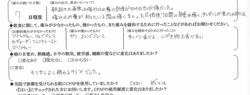 (痛みの程度について) 朝起きた直後は痛み止め薬の効果が切れたせいか痛かった。痛み止め薬が効いている間は痛くない。ただ、術後7日間の毎食は痛く、少しずつしか食べられなかった。