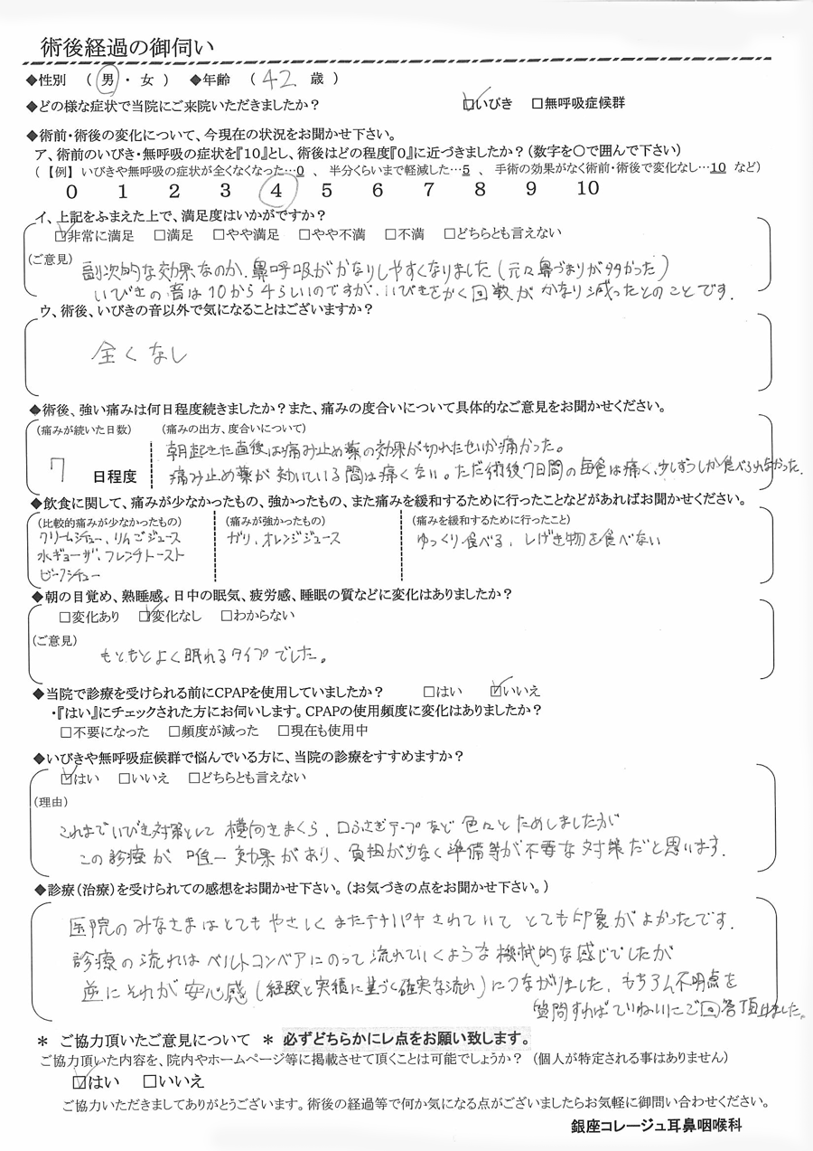 ア, 術前のいびき・無呼吸の症状を『10』だったとすると、術後はどの程度になりましたか? 【4】