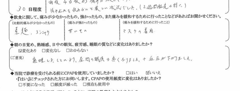 (ご意見) 熟睡した事により、昼間の眠気は無くなりました。+血圧が下がりました。