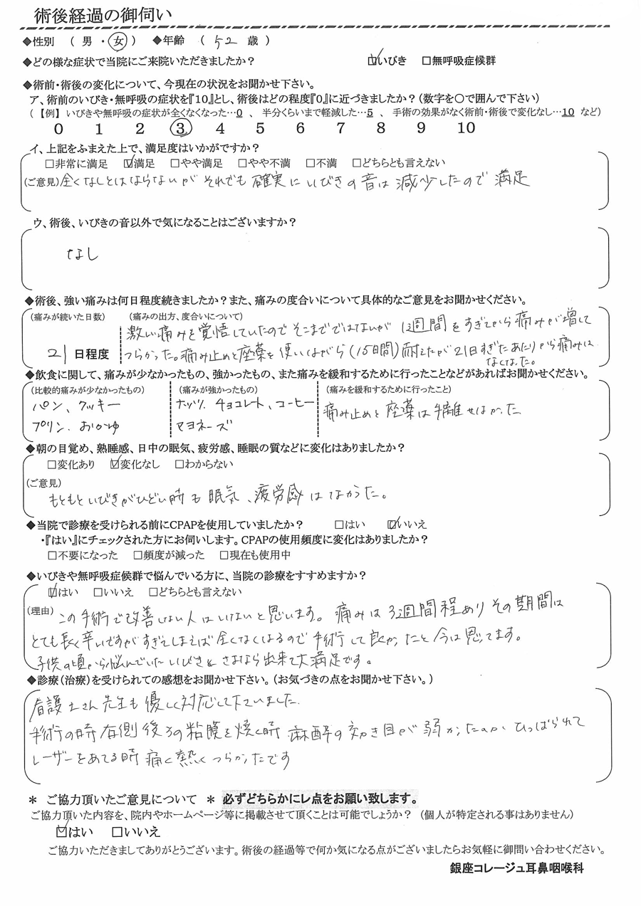 ア, 術前のいびき・無呼吸の症状を『10』だったとすると、術後はどの程度になりましたか? 【3】