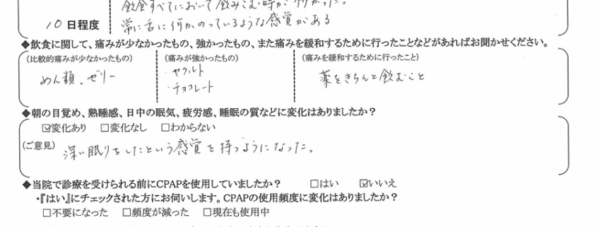 (痛みの程度について) 飲食全てにおいて飲み込む時が怖かった。常に舌に何かが乗っている様な感覚がある。