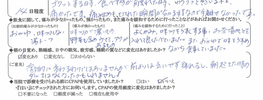 A:(痛みを緩和するために行ったこと)  よく嚙み、味付けを薄くする事。お茶漬けの素を入れて良く食べていました。また、おかゆで味を薄めながら食事していました。