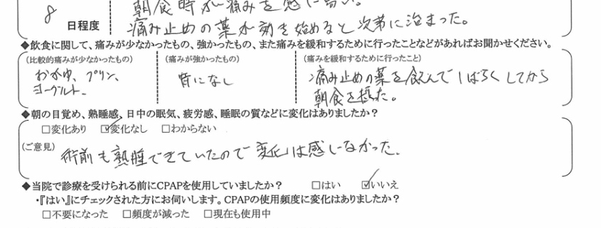 (ご意見) 術前も熟睡できていたので変化は感じなかった。