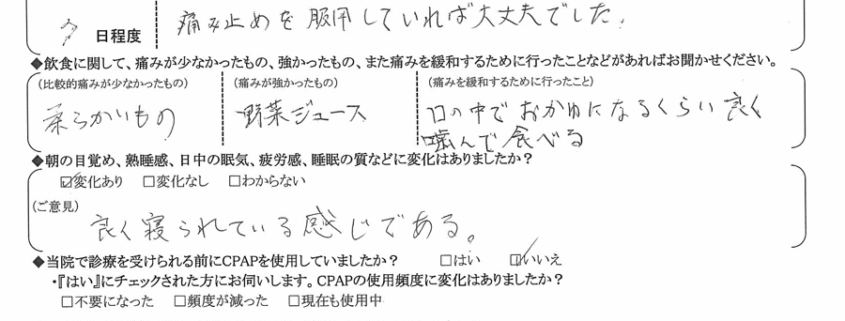 A:(痛みを緩和するために行ったこと) 口の中でおかゆになるくらい、よく噛んで食べる