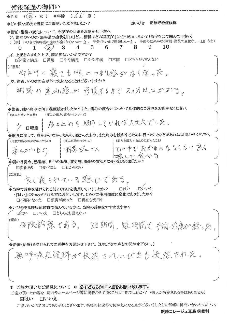 (ご意見) 仰向けに寝ても、のどの詰り感がなくなった。