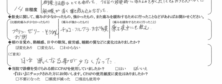 (痛みの程度について) 術後3日間はとても痛かった。7日目の診察時に痛み止めを多く出してもらおうと思いました。朝喉が痛く、唾も飲み込めなかった。
