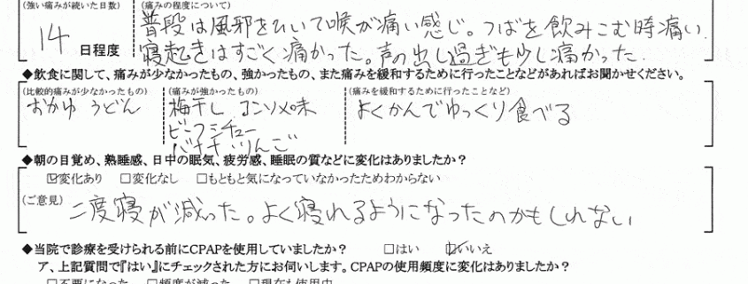A:術中、術後の痛みをかなり覚悟して受けたのですがそれ程でもなくほっとしました。ノドに含む麻酔薬をなるべくのどの奥の方に届くようにしたのもよかったと思います。先生も看護師さんも優しく丁寧に説明してくださり、とても良かったです。本当にありがとうございました。