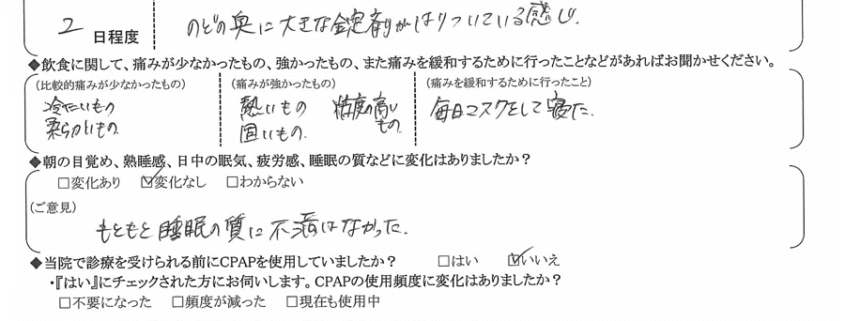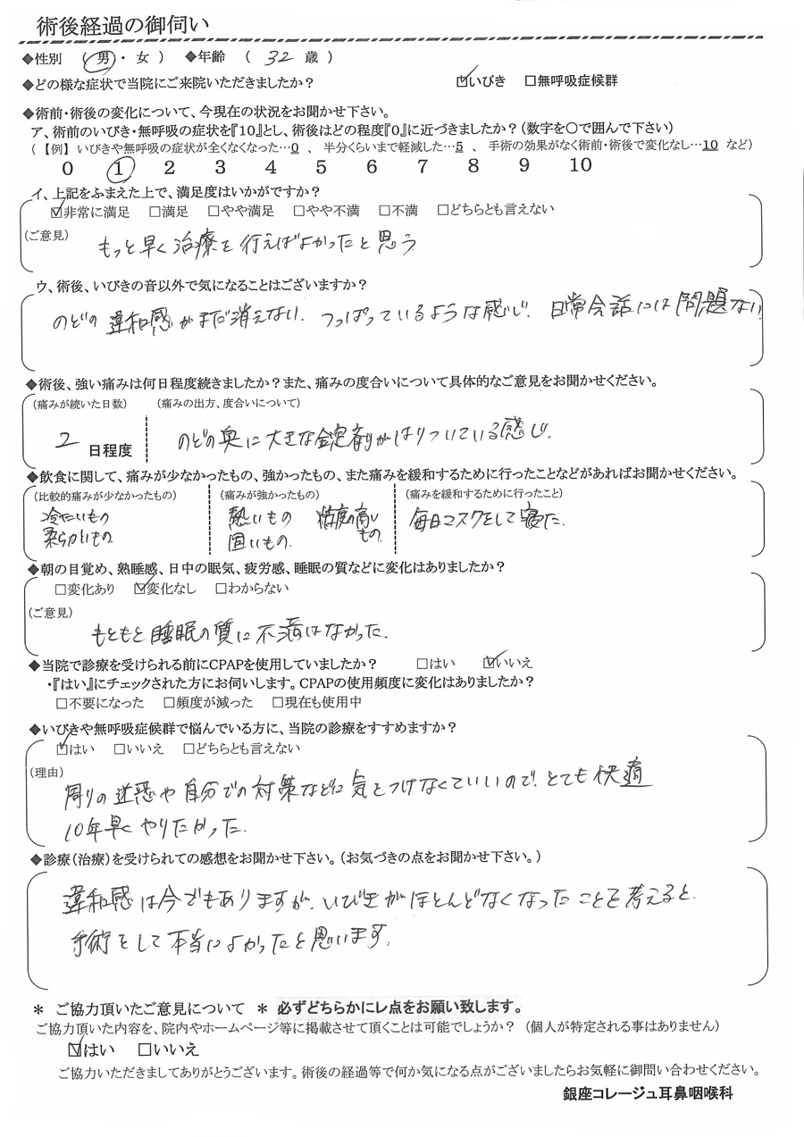 A:違和感は今でもありますが、いびきがほとんど無くなった事を考えると、手術をして本当に良かったと思います。