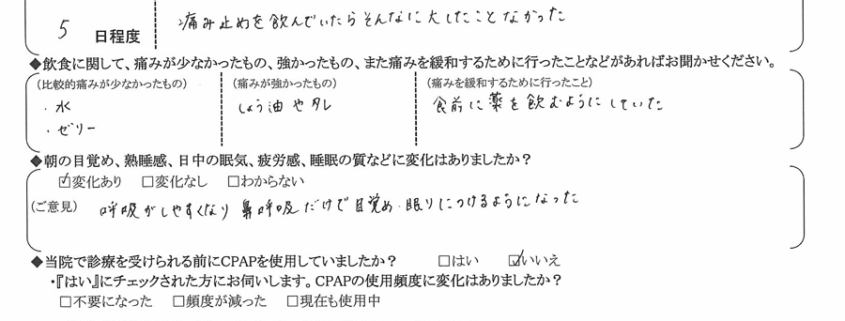 (ご意見) 呼吸がしやすくなり、鼻呼吸だけで目覚め、眠りにつけるようになった。