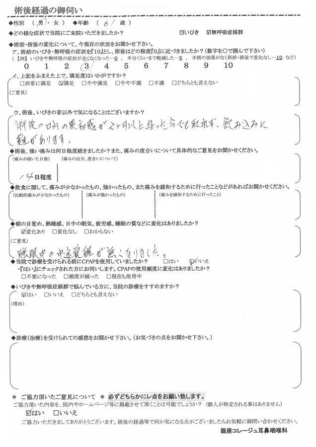 ア, 術前のいびき・無呼吸の症状を『10』だったとすると、術後はどの程度になりましたか? 【3】