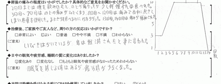 (ご意見) 今までは眠りが浅く、夜中目を覚ますと眠れなかったが、術後は夜中目を覚ましても眠気が残っており、すぐに眠れます。