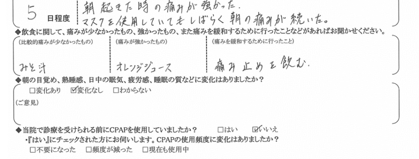 (痛みの程度について) 朝起きた時の痛みが強かった。マスクを使用していても、しばらくアサノ痛みが続いた。