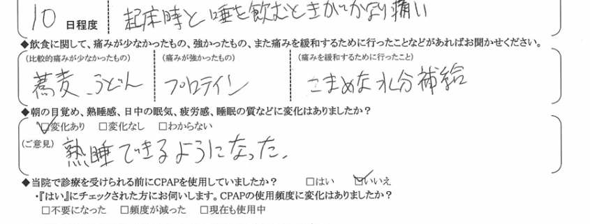 (痛みの程度について) 起床時と唾を飲む時がかなり痛い。