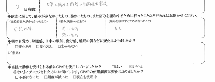 (痛みの程度について) 喉の痛みは風邪の初期症状程度。