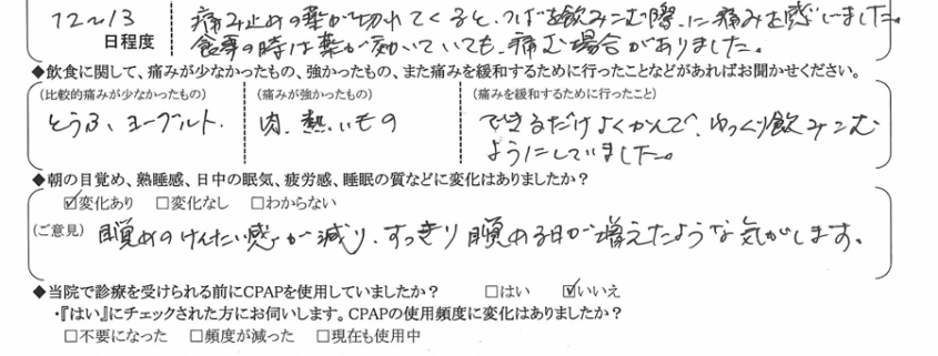 A:(痛みを緩和するために行ったこと) できるだけ、よく噛んでゆっくり飲み込む様にしていました。