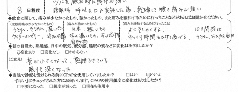 (痛みの程度について) 唾を飲む時に痛みが強い。睡眠時、呼吸を口で実施した為、乾燥して喉の痛みが強い。