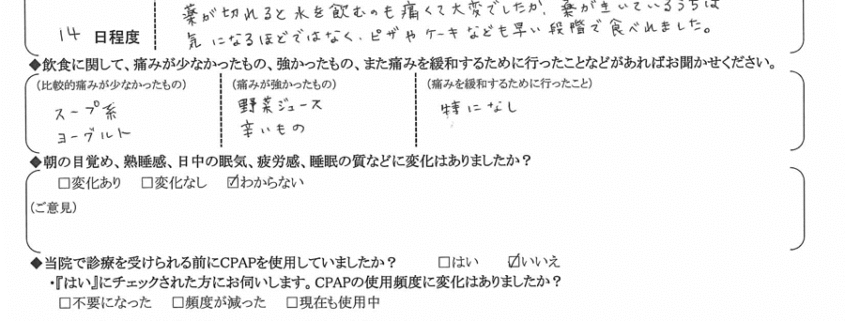 (痛みの程度について) 薬が切れると水を飲むのも痛くて大変でしたが、薬が効いているうちは気になる程ではなく、ピザやケーキなども早い段階で食べられました。