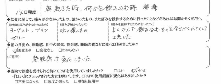 A:(痛みを緩和するために行ったこと) よく噛んで、飲み込む物をなるべく小さくして工夫した。