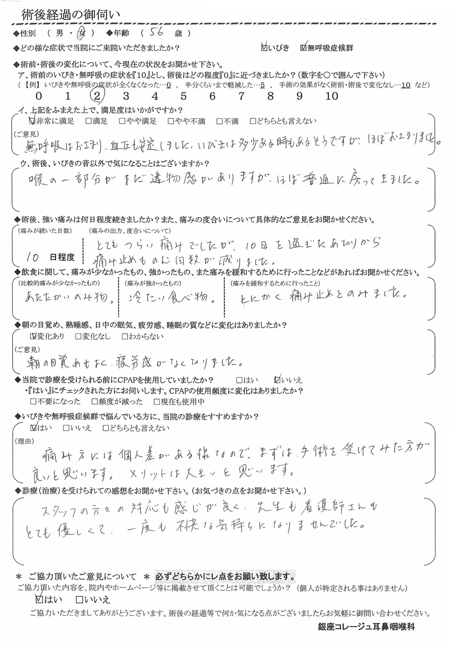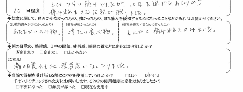 (ご意見) 無呼吸は治まり、血圧も安定しました。いびきは多少ある時もあるそうですが、ほぼ治まりました。