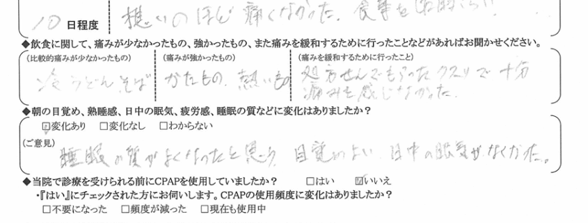 (痛みの程度について) 思いの程、痛くなかった。食事をした時ぐらい。