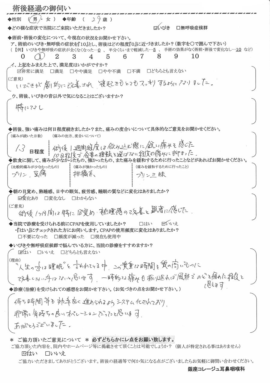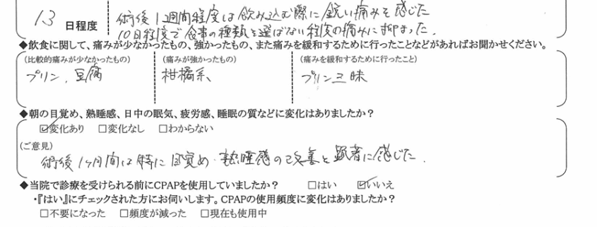 (ご意見) 術後1ヶ月間は特に目覚め・熟睡感の改善を顕著に感じた。