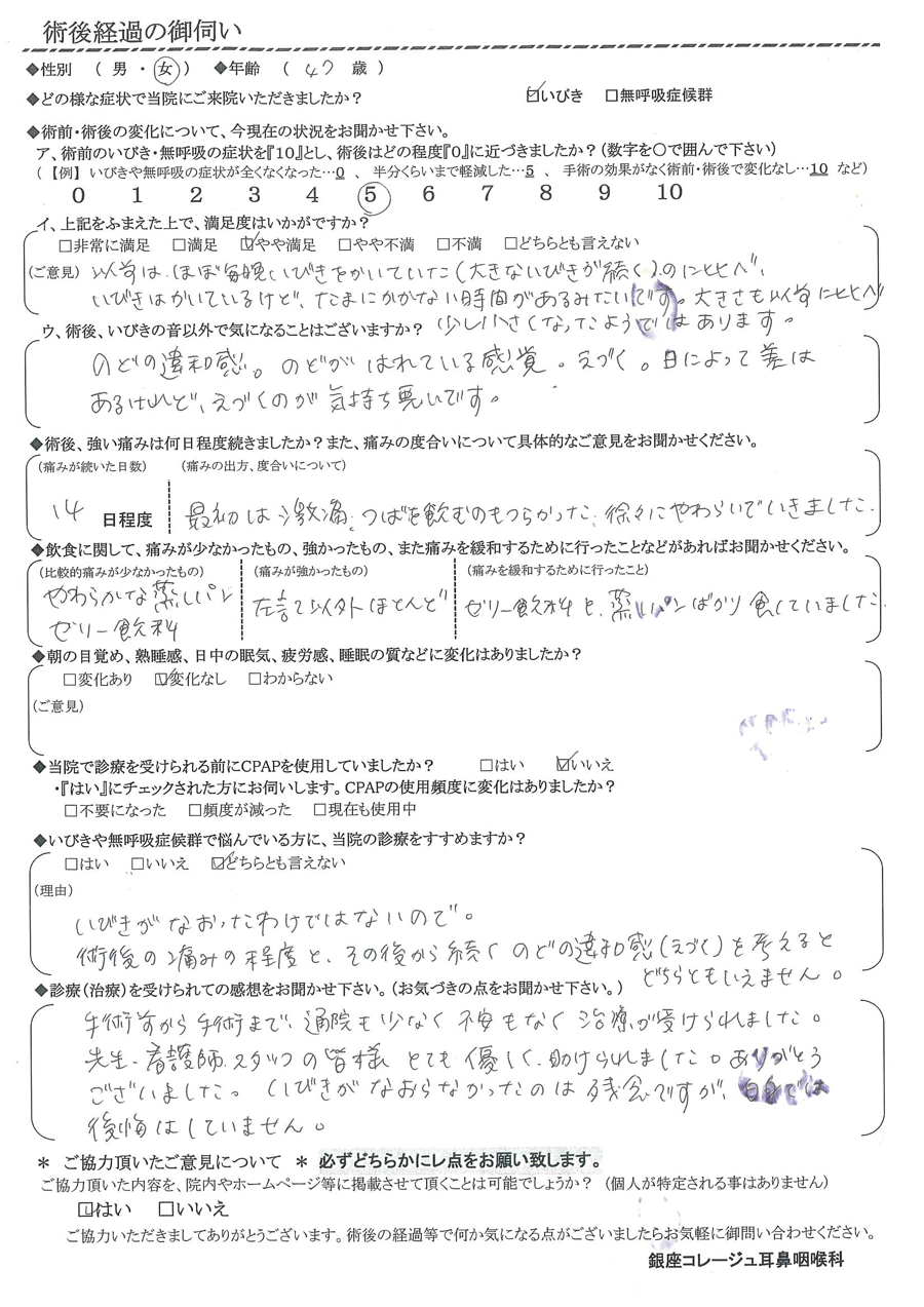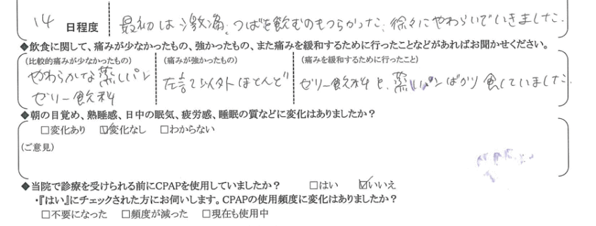 (理由) いびきが治ったわけではないので。術後の痛みの程度と、その後から都筑喉の違和感(えづく)を考えると、どちらとも言えません。