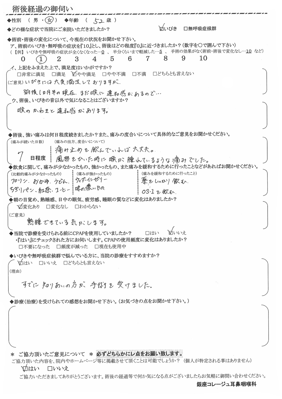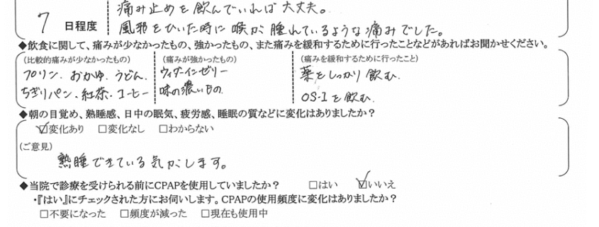 (ご意見)  いびきには大変満足しておりますが、術後1ヶ月半の現在、まだ喉に違和感があるので…