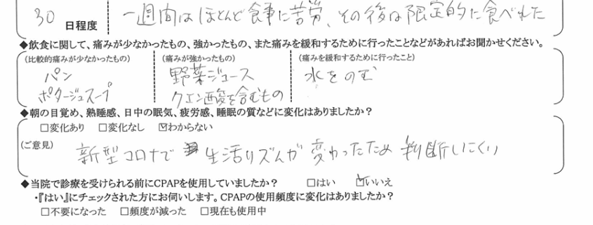 (痛みの程度について)  一週間はほとんど食事に苦労。その後は限定的に食べられた。