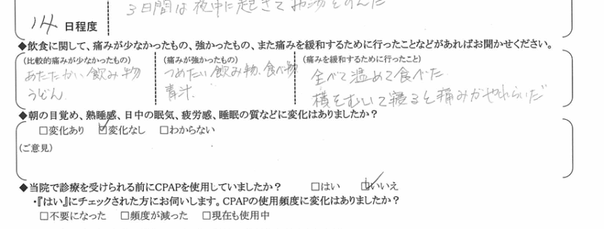(痛みの程度について) 3日間は夜中に起きて、お湯を飲んだ。