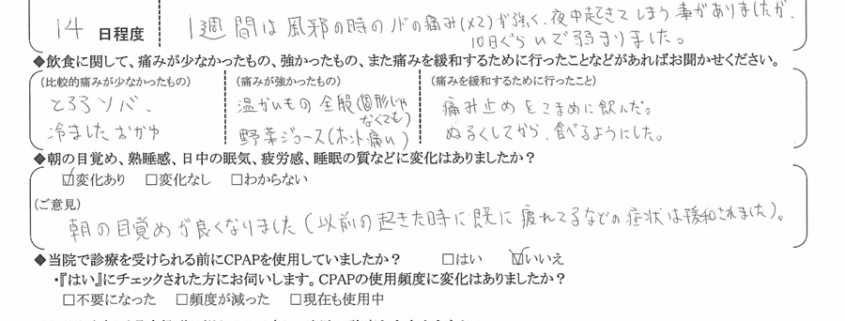 (ご意見) 朝の目覚めが良くなりました。(以前の、起きた時に既に疲れるなどの症状は緩和されました)