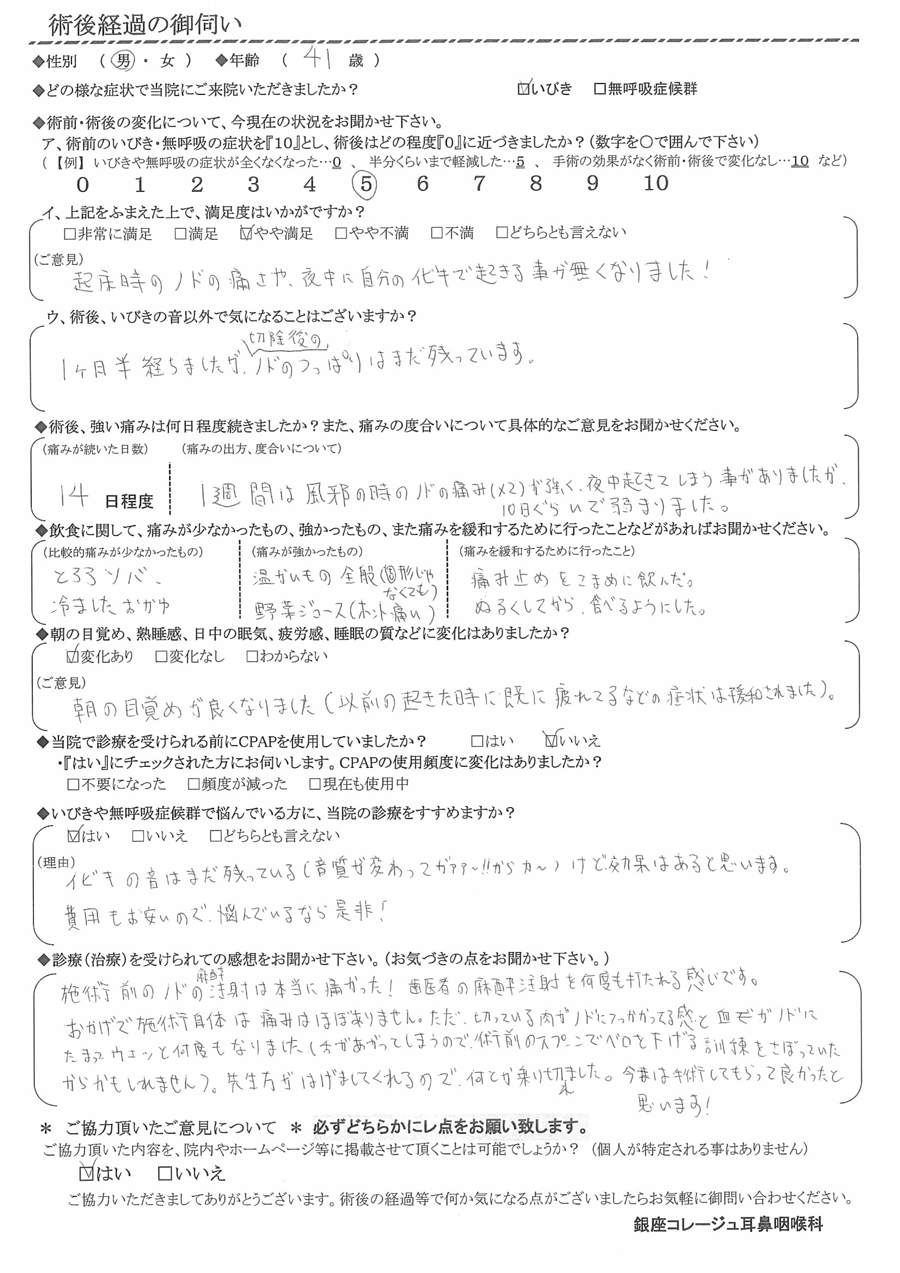 (ご意見) 起床時の喉の痛さや、夜中に自分のイビキで起きる事が無くなりました!