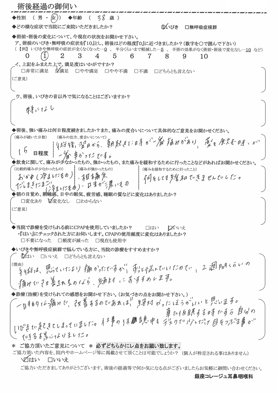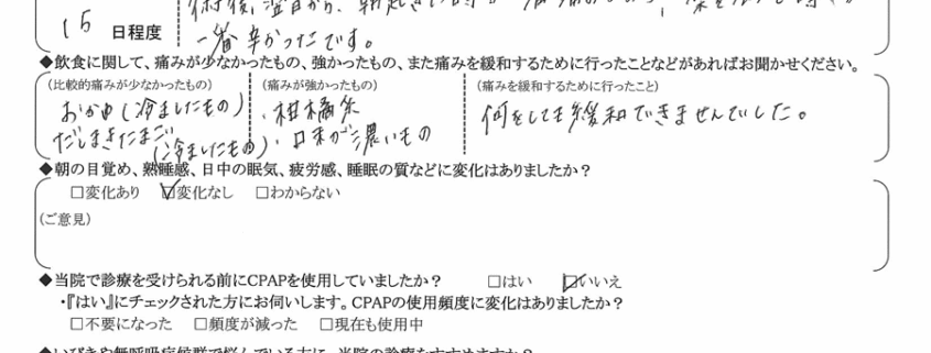 A:一時的な痛みで、改善するのであれば、絶対やった方が良いと思います。いびきで起きてしまっていました。