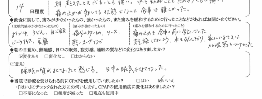 A:(痛みを緩和するために行ったこと)  痛み止めを食事の前に飲んでいた・乾燥しないように水を飲んだり、家にいる時は加湿器をつけていた