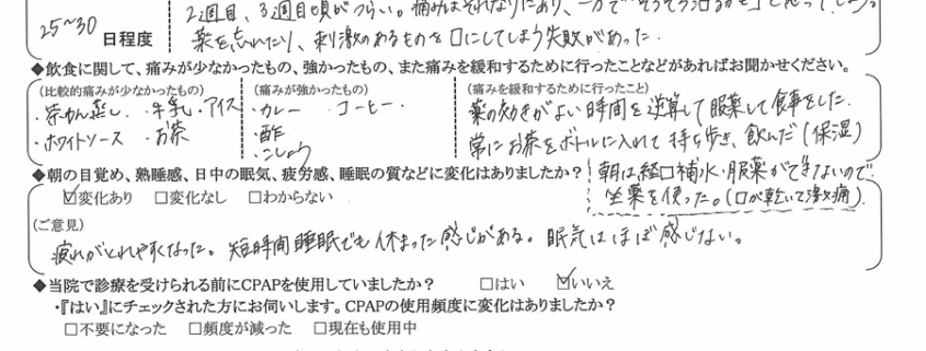 (痛みの程度について) 2週目、3週目頃が辛い。痛みはそれなりにあり、一方で「そろそろ治るかも」と思ってしまう。薬を忘れたり、刺激のある物を口にしてしまう失敗があった。