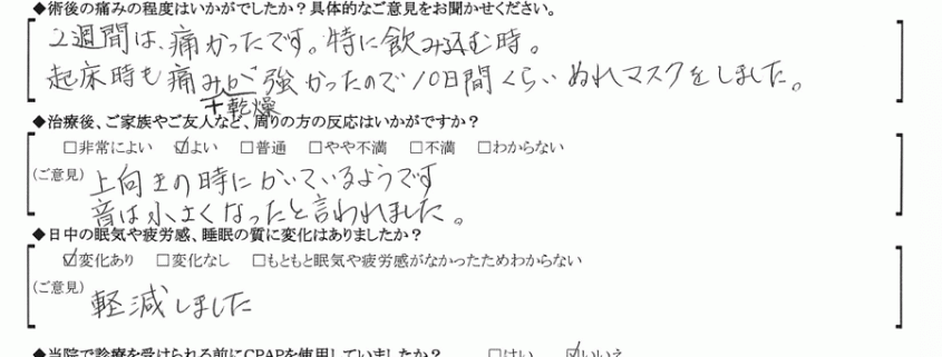 (ご意見) 手術を受けたその夜からいびきを全くかかなくなりました。痛くてつらい日もありましたが、いびきのストレスやコンプレックスがなくなったのでそれが嬉しくて、本当に満足しています。