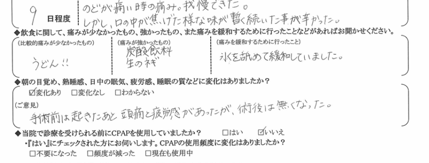 (ご意見) 手術前は起きた後、頭痛と疲労感があったが、術後は無くなった。