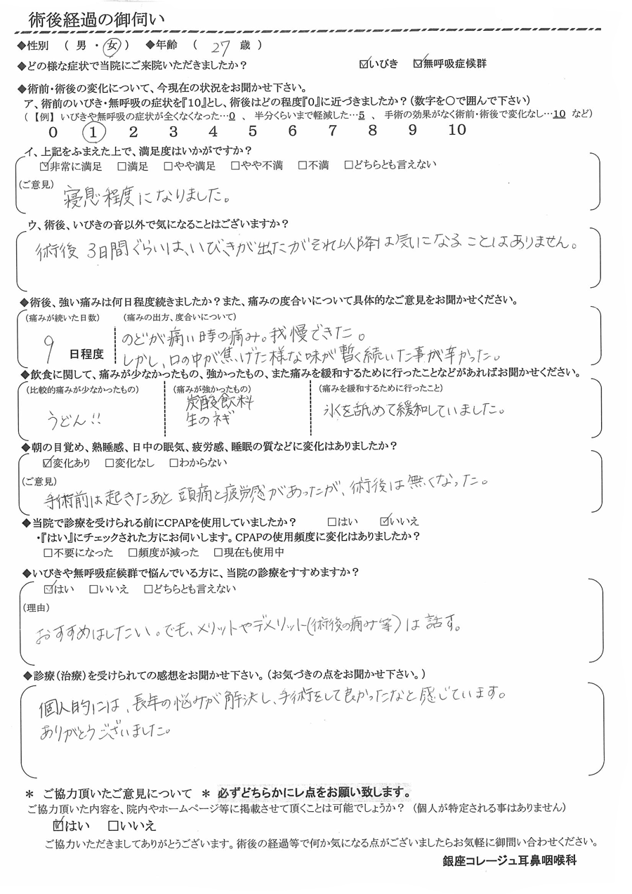術後3日間ぐらいはいびきが出たが、それ以降は気になる事はありません。