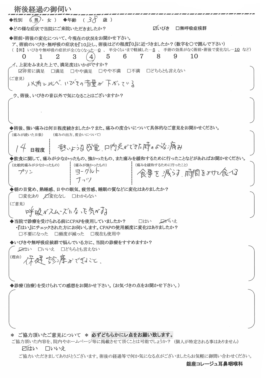 ア, 術前のいびき・無呼吸の症状を『10』だったとすると、術後はどの程度になりましたか? 【4】