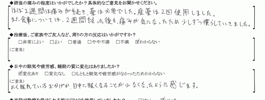 痛みはかなり辛かったがいびき・無呼吸共に軽減、睡眠の質も良くなり日中眠くなる事がなくなった