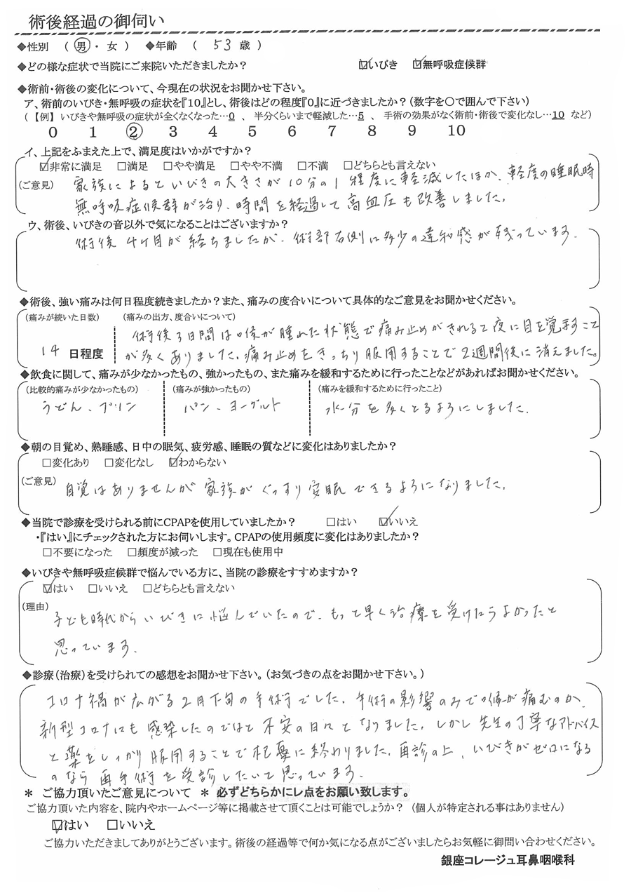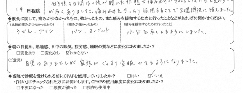 家族によるといびきの大きさが10分の1程度に軽減したほか、軽度の睡眠時無呼吸症候群が治り、時間を経過して高血圧も改善しました。