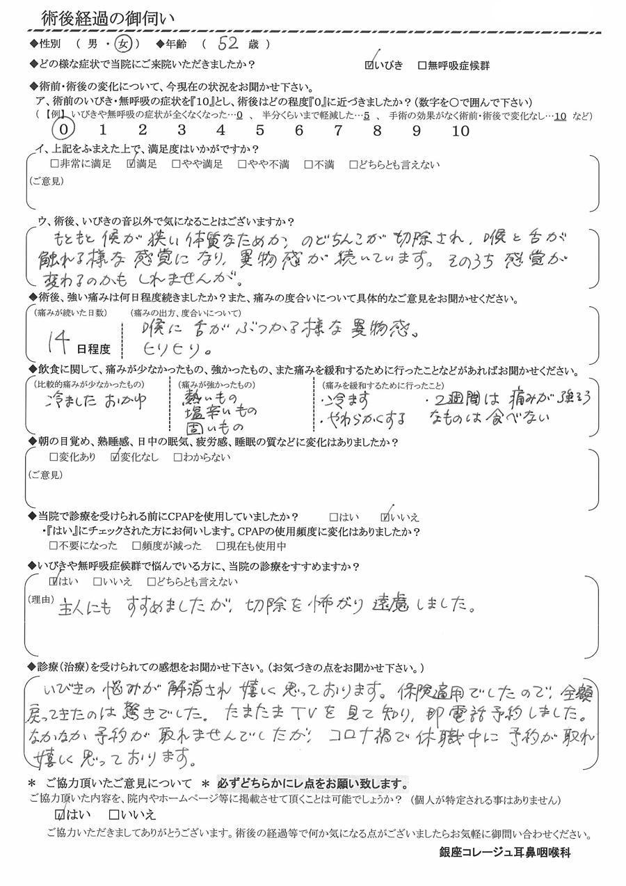 A: いびきの悩みが解消され嬉しく思っております。保険適用でしたので、全額戻ってきたのは驚きでした。たまたまTVを見て知り、即電話予約しました。なかなか予約が取れませんでしたが、コロナ禍で休職中に予約が取れ嬉しく思っております。