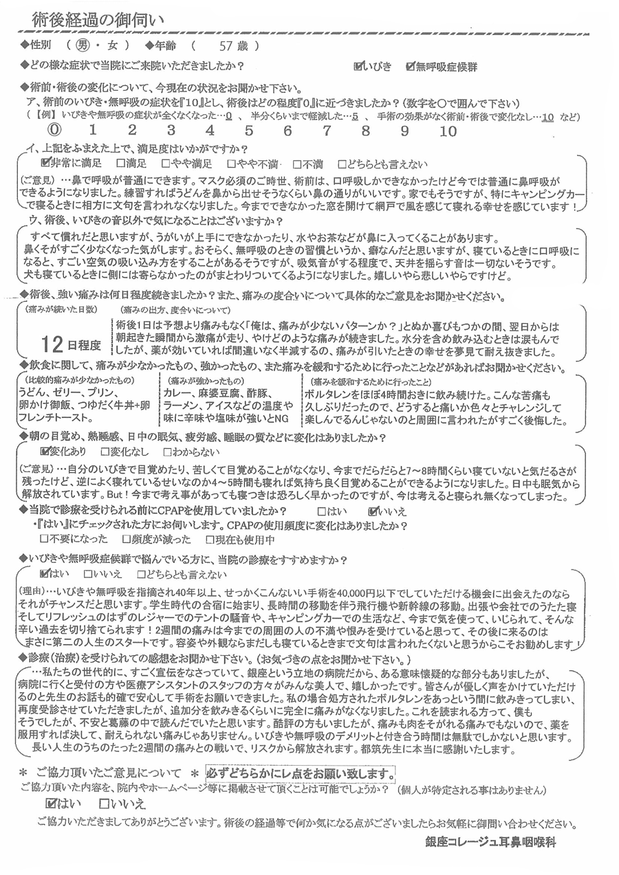 (理由)いびきや無呼吸を指摘され40年以上、せっかくこんな良い手術を40,000円以下でして頂ける機会に出会えたのなら、それがチャンスだと思います。学生時代の合宿に始まり、長時間の移動を伴う飛行機や新幹線の移動。