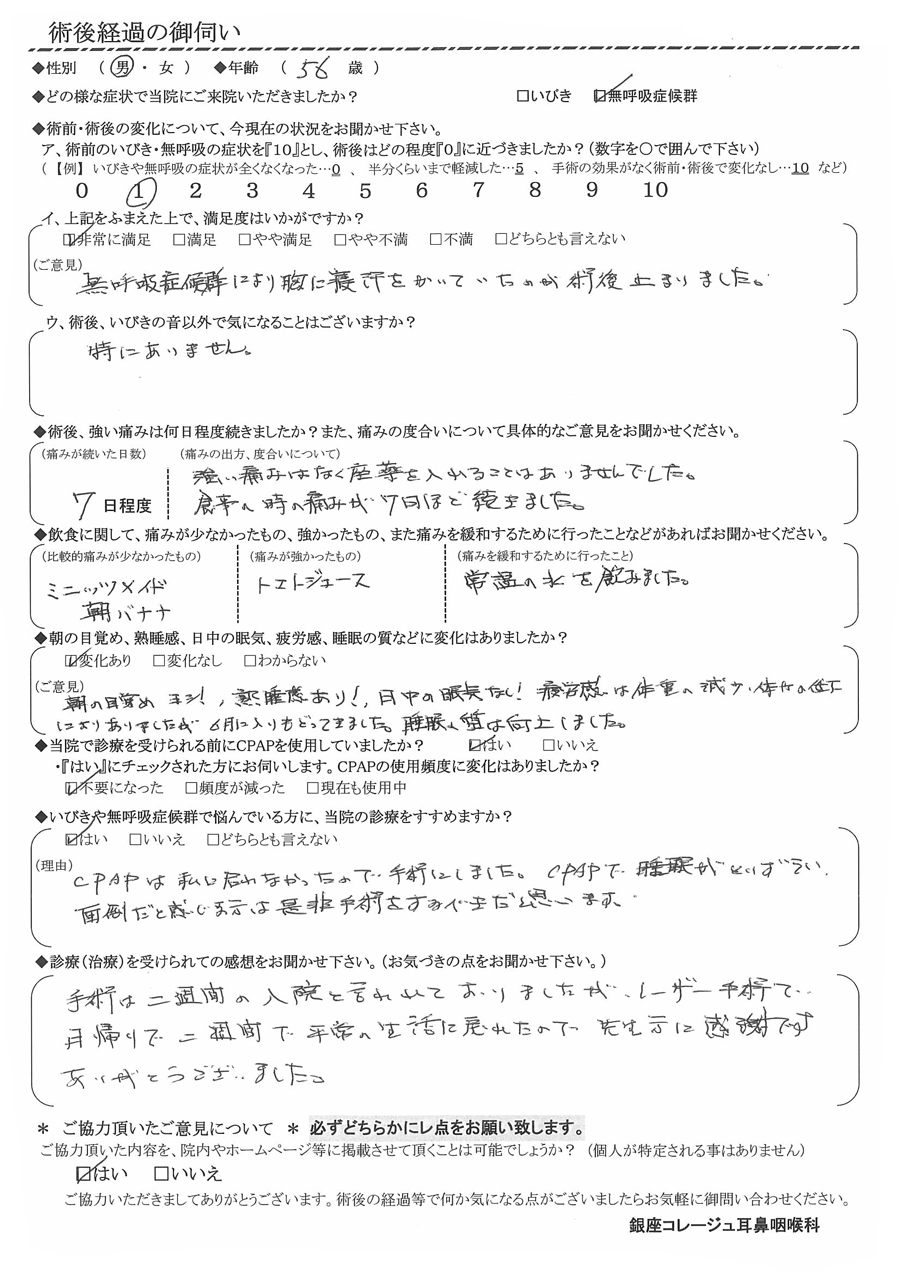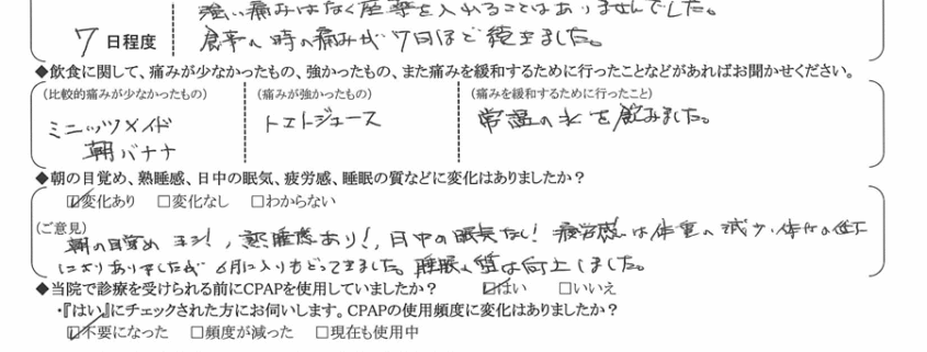 (ご意見) 無呼吸症候群により、胸に汗をかいていたが、術後は止まりました。