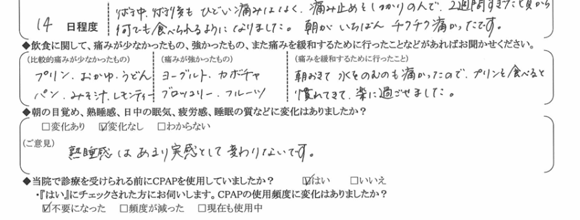 (痛みの程度について) 術中・術後もひどい痛みはなく、痛み止めをしっかり飲んで、2週間過ぎた頃から何でも食べられるようになりました。朝が一番チクチク痛かったです。