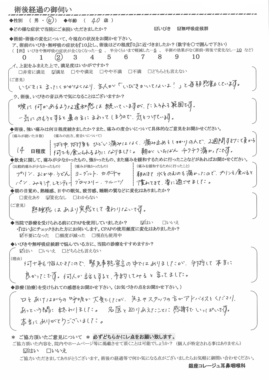 (ご意見) いびきは全くかかなくなり、主人が「いびき、かいてないよ!」と毎朝感動しています。