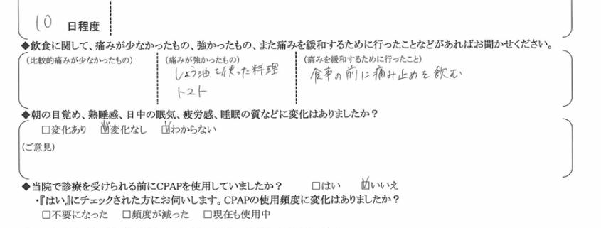 A:(痛みを緩和するために行ったこと) 食事の前に痛み止めを飲む