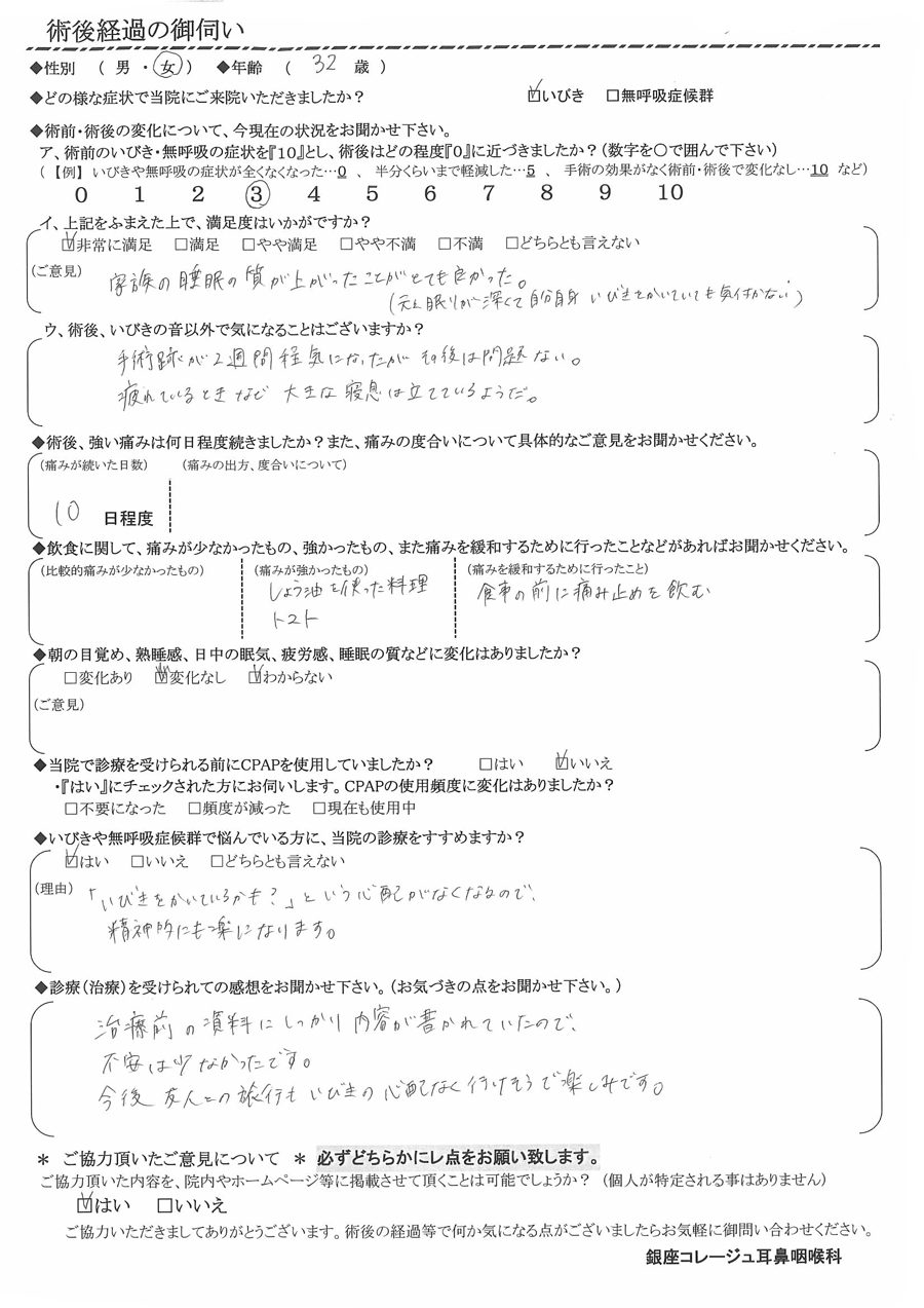 ア, 術前のいびき・無呼吸の症状を『10』だったとすると、術後はどの程度になりましたか? 【3】