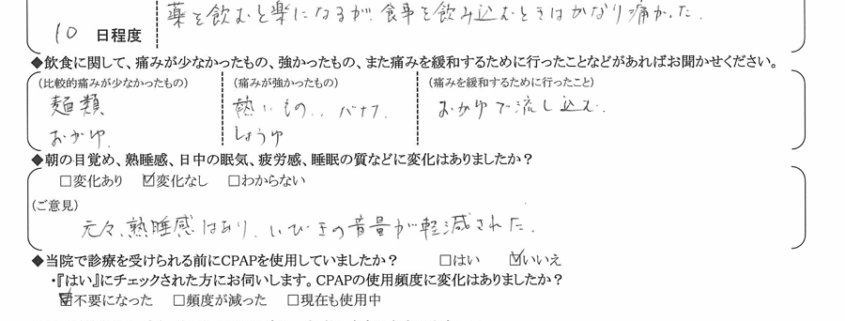 (痛みの程度について) 薬を飲むと楽になるが食事を飲み込むときはかなり痛かった。