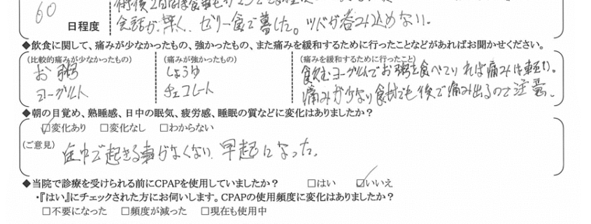 術後2日間は食事もガマンできる程度でしたが、その後10日間は痛みが増して会話が辛く、ゼリー食で暮らした。ツバが呑み込めない。