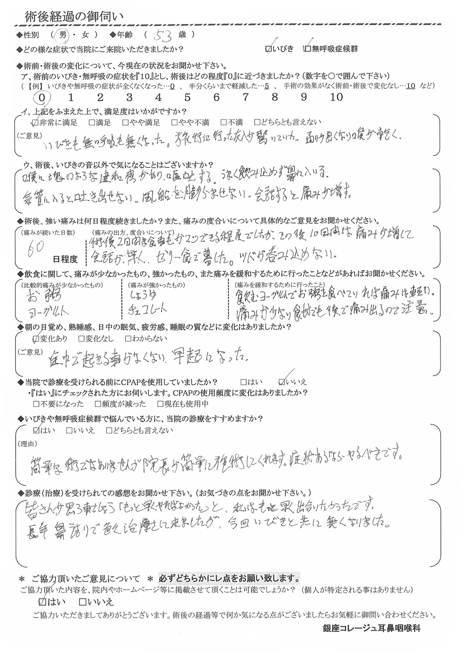 ア, 術前のいびき・無呼吸の症状を『10』だったとすると、術後はどの程度になりましたか? 【0】